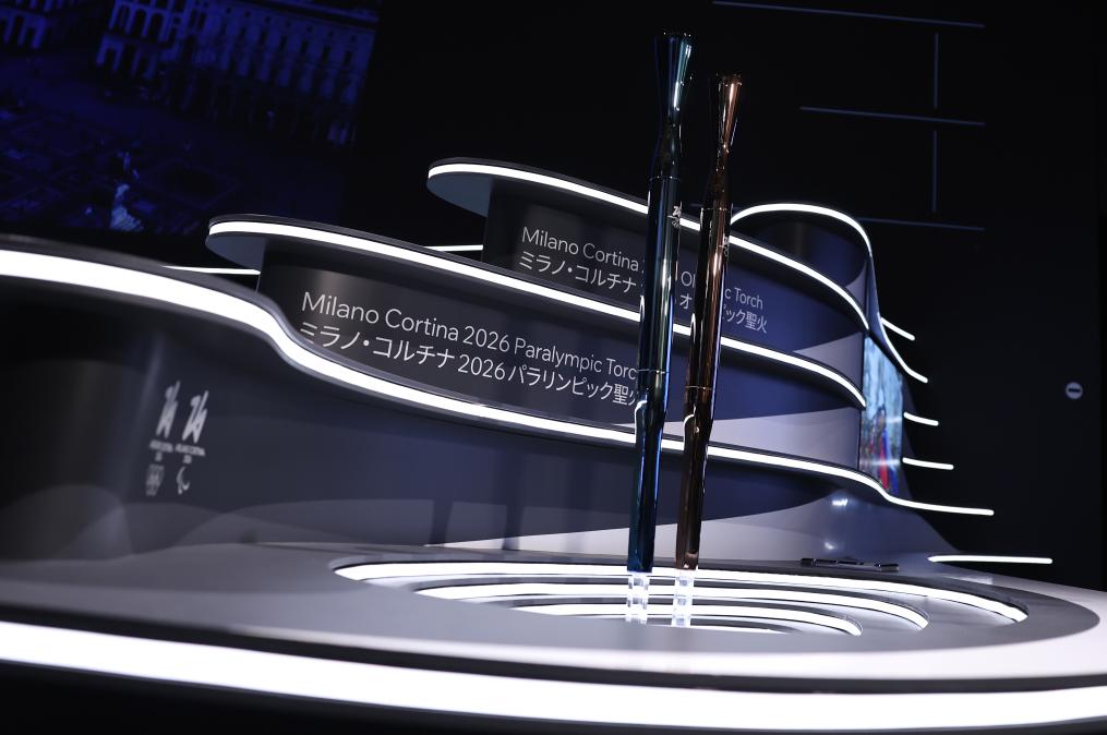 這是4月14日在米蘭發布活動現場拍攝的2026年米蘭-科爾蒂納丹佩佐冬奧會火炬(左)和冬殘奧會火炬