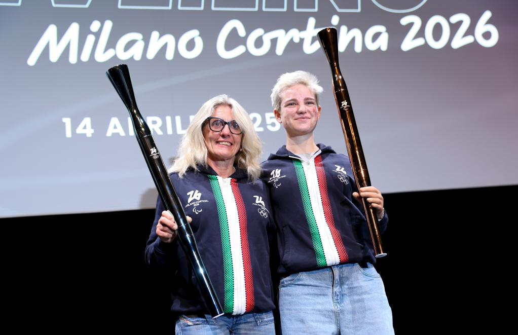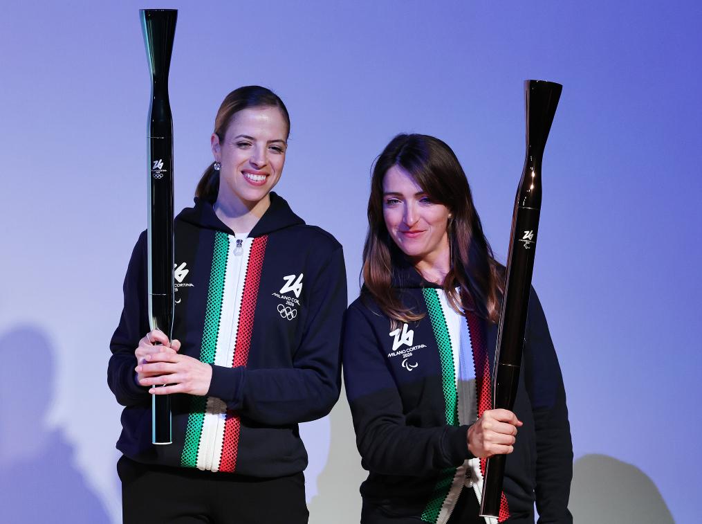 4月14日,冬奧會冠軍斯特凡妮婭·貝爾蒙多(左)和殘奧會冠軍貝貝·維奧在米蘭舉行的發布活動上展示火炬
