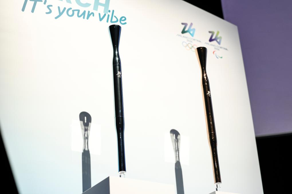 在大阪·關西世博會意大利館展出的2026年米蘭-科爾蒂納丹佩佐冬奧會火炬(左)和冬殘奧會火炬