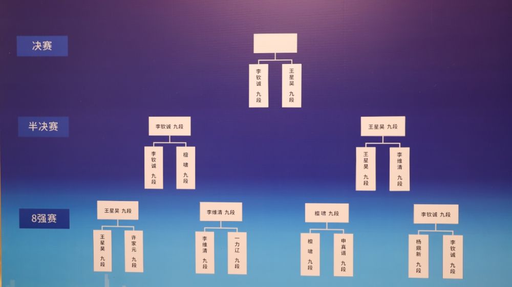 21歲的王星昊曾在今年2月的南洋杯決賽中向個人首個世界冠軍發起衝擊,但在三番棋中0:2不敵韓國名將申真谞。申真谞在本屆“北海新繹杯”的八強戰中被檀嘯淘汰,後者也成為中國棋手包攬本次比賽四強的大功臣。26歲的李欽誠擅長快棋,綽號“快刀”,曾在今年的南洋杯上獲得季軍。兩人之間的決賽將於17日至19日在北海市潿洲島進行,三盤兩勝。