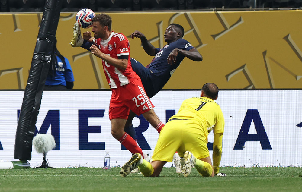 7月5日,穆勒(左)與巴黎聖日耳曼隊的努諾·門德斯(中)在比賽中拼搶,用頭搶先觸球。新華社記者 李明 攝