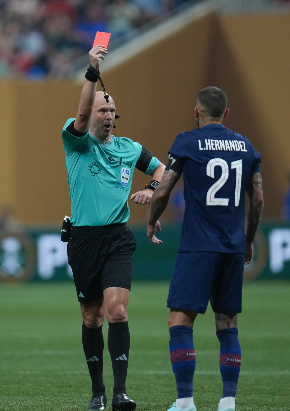 7月5日,主裁判安東尼·泰勒(左)向巴黎聖日耳曼隊球員盧卡斯·埃爾南德斯出示紅牌。新華社記者 黃宗治 攝