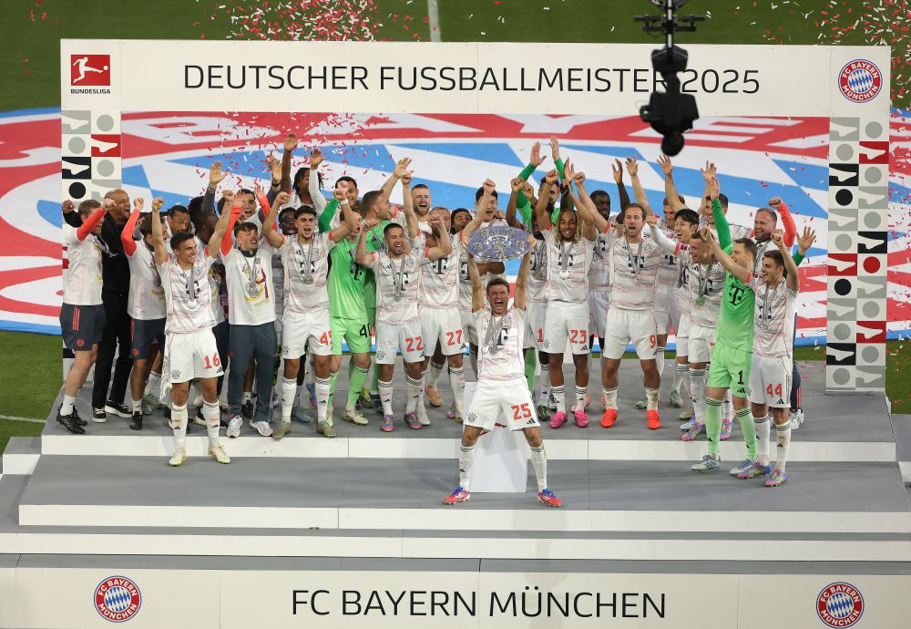 2025年5月10日,穆勒(前中)在頒獎儀式上高舉獎盃與隊友慶祝拜仁慕尼黑隊取得歷史上第33個德甲冠軍。新華社發(菲利普·魯伊茲攝)