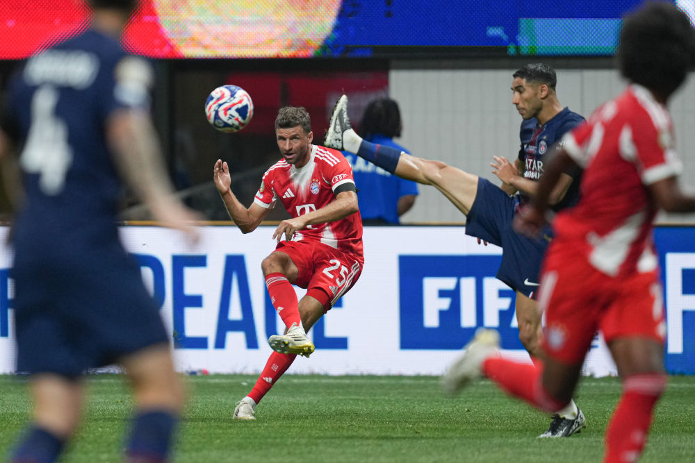 禁區內一次混戰中,面對巴黎聖日耳曼球員高高抬起的解圍動作,35歲的托馬斯·穆勒毫不猶豫俯身衝頂,用頭搶先觸球,險些為拜仁拼出一粒點球。