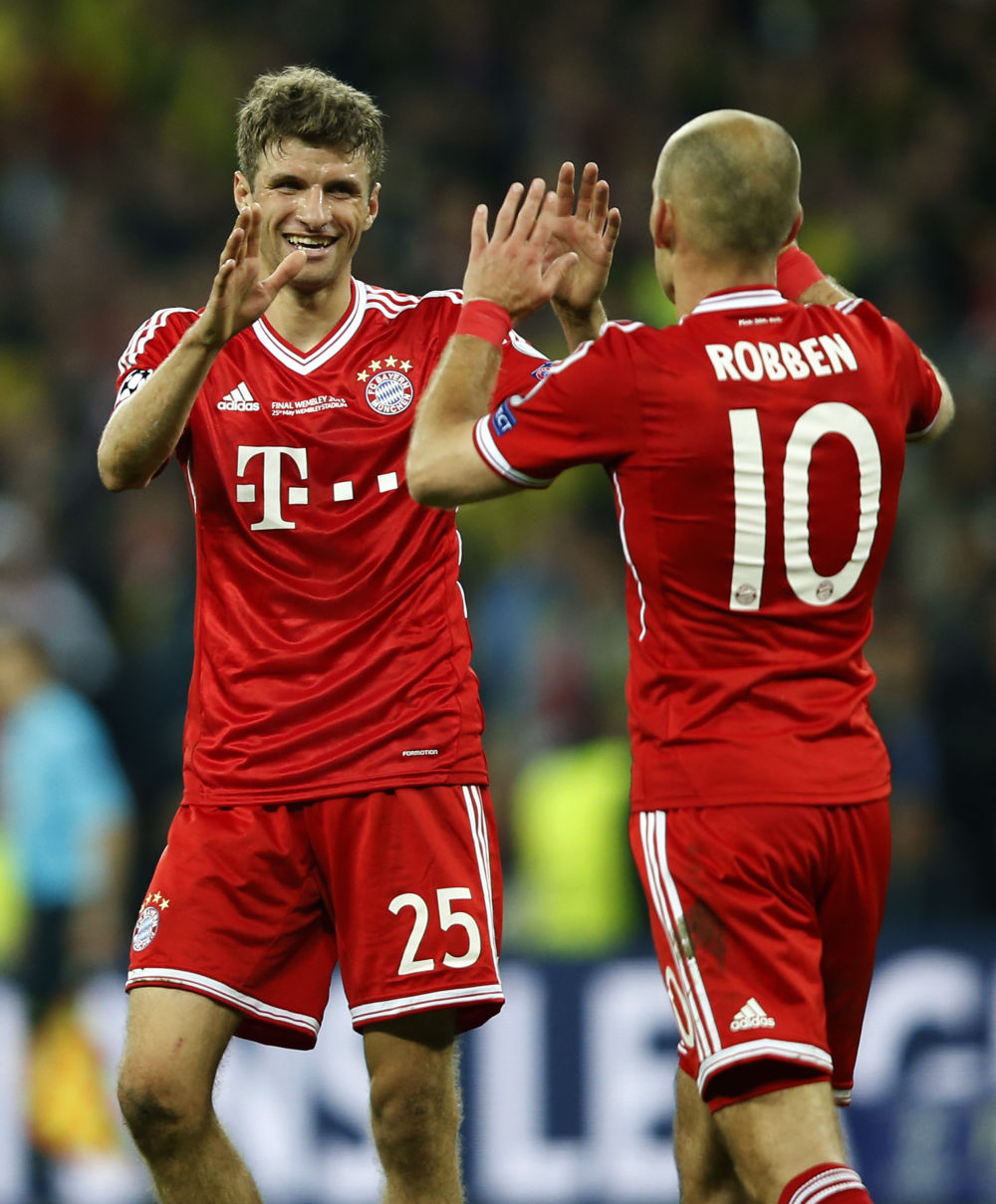 2013年5月25日,拜仁在2012-2013賽季歐冠聯賽決賽中2:1戰勝另一支德甲球隊多特蒙德,奪得冠軍。這是穆勒第一次跟隨拜仁拿到歐冠冠軍。圖為穆勒(左)祝賀羅本進球。新華社記者 王麗莉 攝