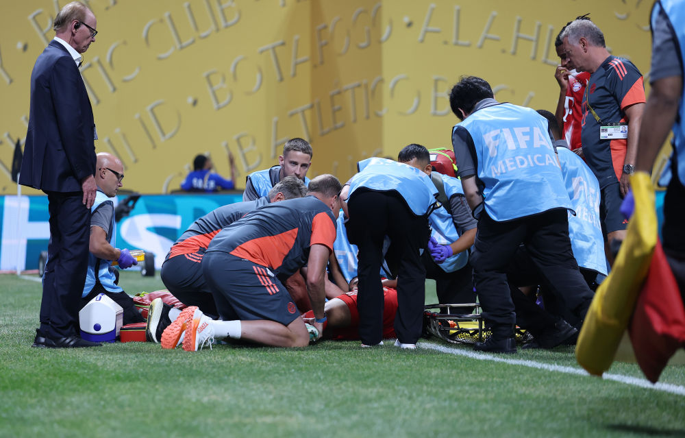 穆西亞拉在場邊接受治療。新華社記者 李明 攝