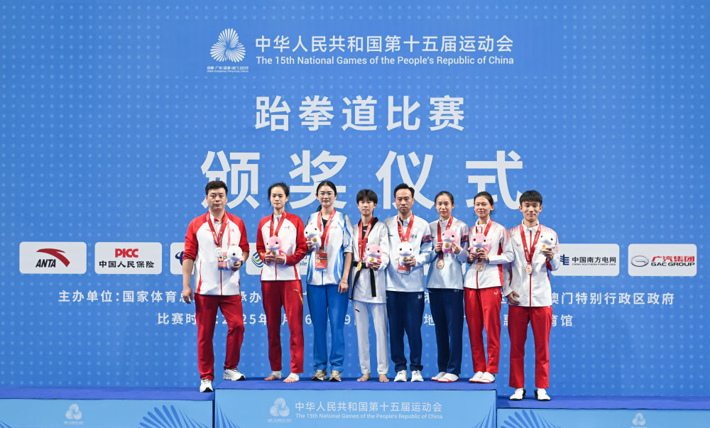 獲獎選手與教練員在廣東惠州舉行的第十五屆全運會跆拳道項目女子49公斤級決賽頒獎儀式上合影。新華社記者 肖恩楠 攝
