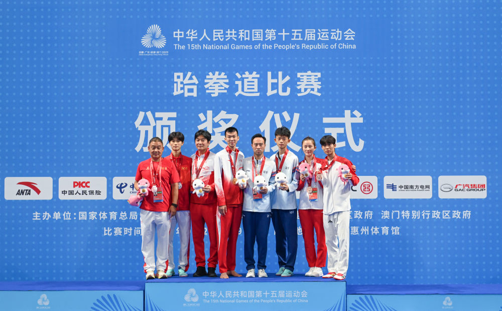 獲獎選手與教練員在廣東惠州舉行的第十五屆全運會跆拳道項目男子58公斤級決賽頒獎儀式上合影。新華社記者 肖恩楠 攝
