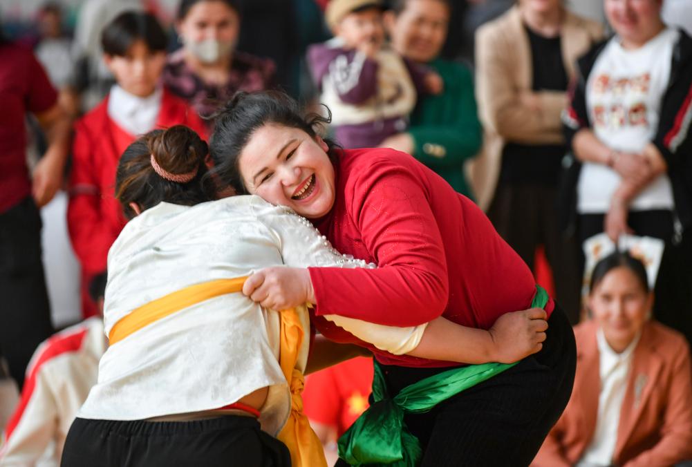 4月12日,村民在新疆於田縣全民健身中心參加女子摔跤比賽。新華社記者 胡虎虎 攝