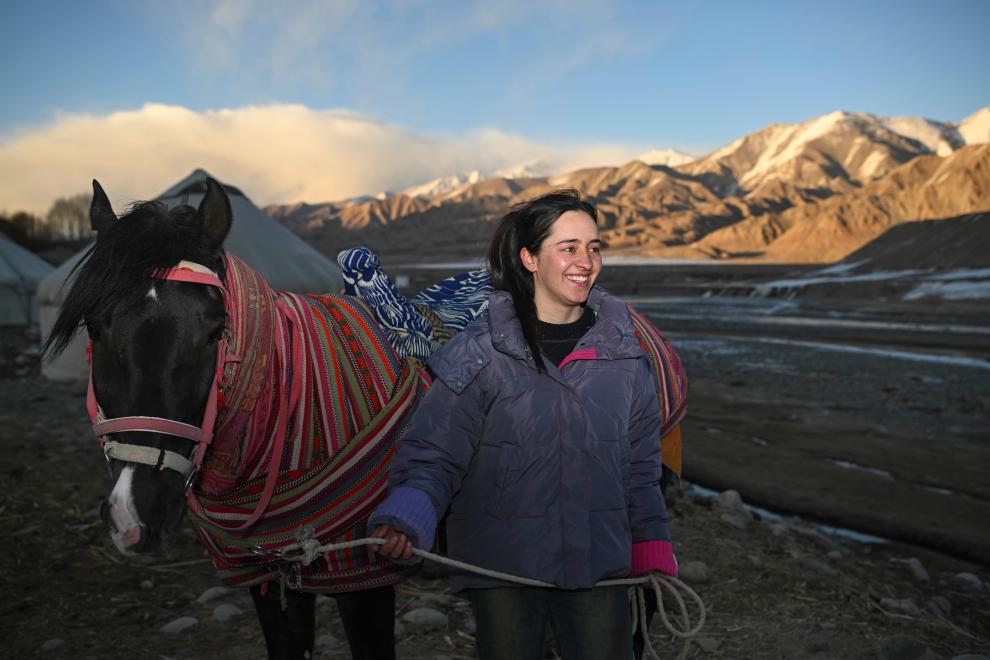 這是在新疆塔縣塔什庫爾幹鄉薩熱吉勒尕村拍攝的馴馬中的古麗艾薩·迪汗。新華社記者 胡虎虎 攝