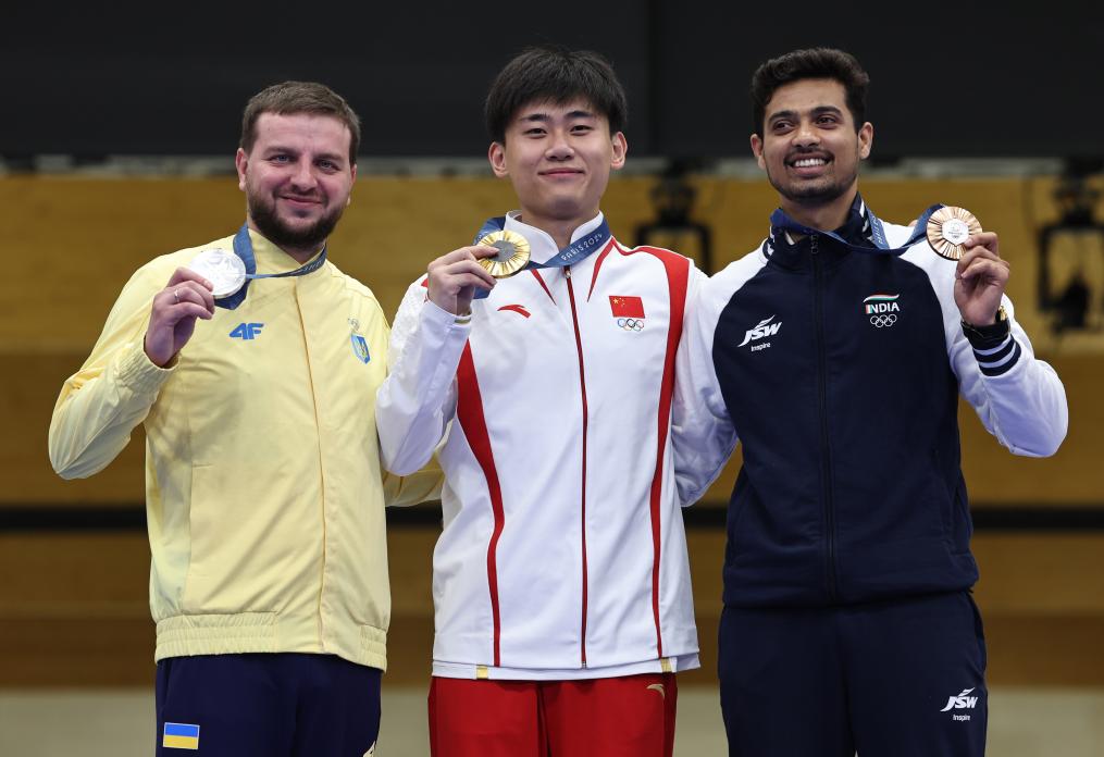 2024年8月1日,冠軍中國選手劉宇坤(中)、亞軍烏克蘭選手庫利什(左)和季軍印度選手庫薩萊在頒獎儀式上。當日,在法國沙托魯舉行的巴黎奧運會射擊男子50米步槍三姿決賽中,中國選手劉宇坤奪得冠軍。新華社記者 張帆 攝
