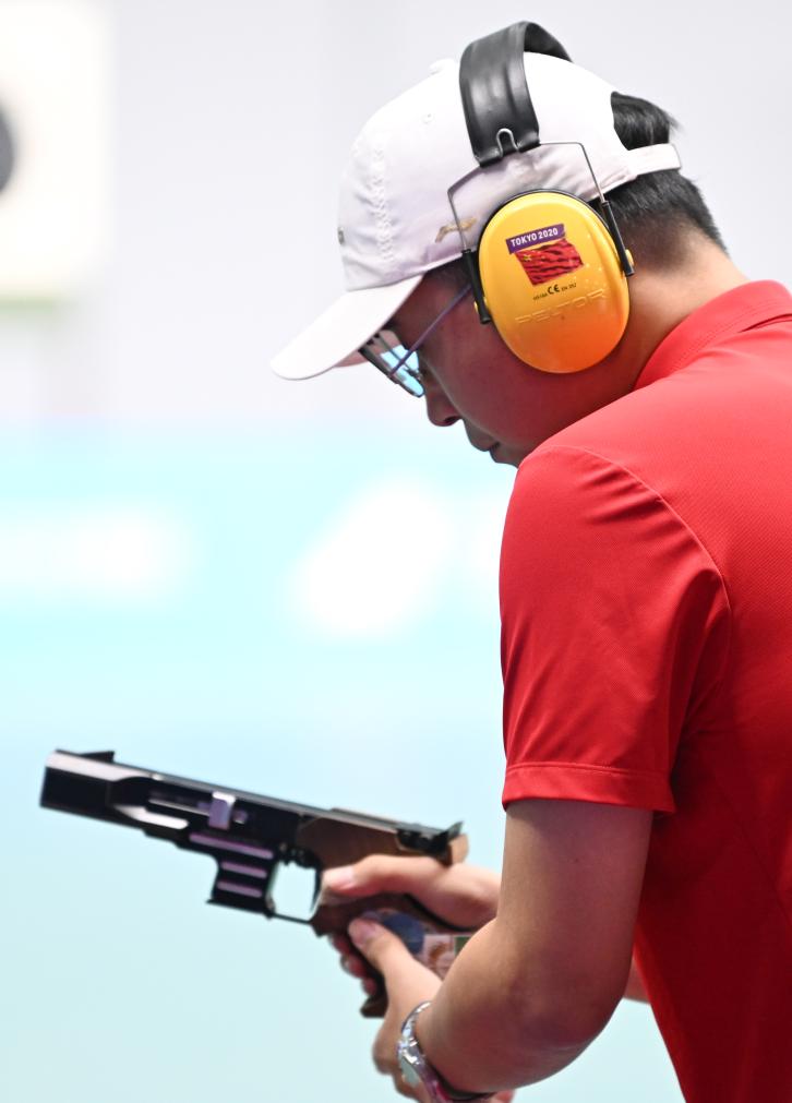 10月14日,山東隊選手李越宏在男子25米手槍速射團體決賽中。新華社記者 鄧華 攝