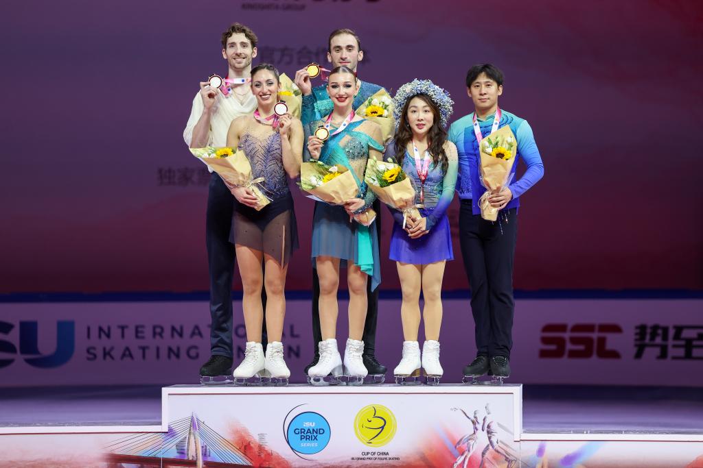 10月25日,冠軍格魯吉亞組合阿納斯塔西婭·梅特爾基娜(前左二)/盧卡·別魯拉瓦(後右)、亞軍意大利組合薩拉·孔蒂(前左一)/尼科洛·馬西(後左)和季軍中國組合隋文靜(右二)/韓聰在頒獎儀式上合影。新華社記者 黃偉 攝