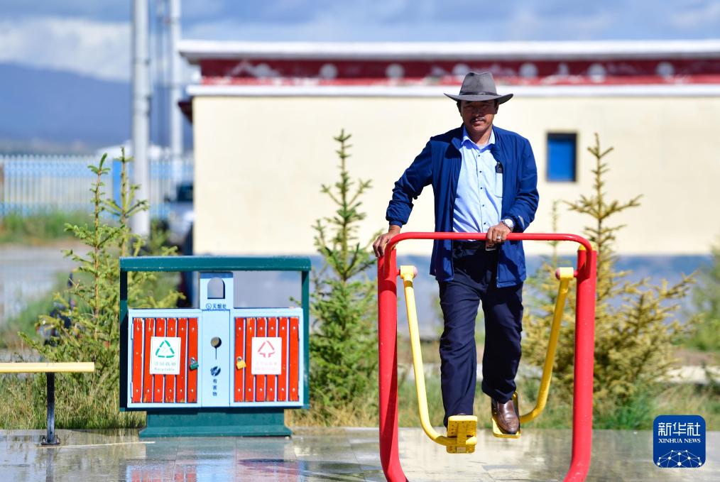 在青海省海南藏族自治州共和縣廿地鄉切扎村,村民在村裏休閒健身(2020年8月17日攝)。新華社記者張龍攝
