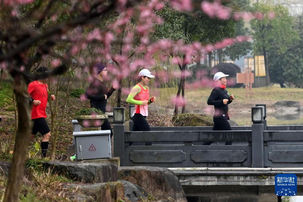 2023年3月1日,跑步愛好者在浙江省寧波市奉化區仁湖公園晨跑。新華社記者黃宗治攝