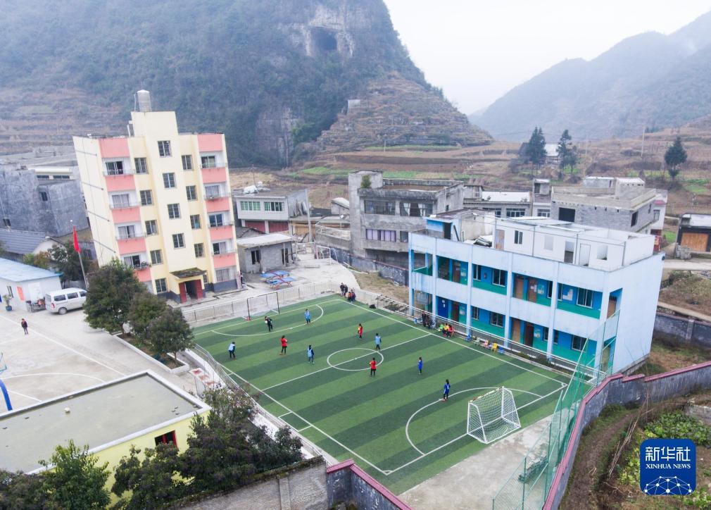2020年1月2日,在貴州省畢節市大方縣對江鎮元寶小學,孩子們在進行足球比賽。新華社發(羅大富攝)