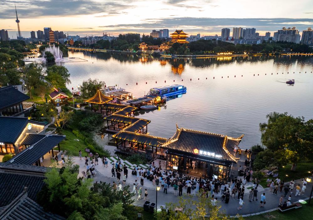 6月28日,人們在泰州市海陵區桃園景區游玩(無人機照片)。據悉,在江蘇省城市足球聯賽泰州隊主場比賽期間,聯賽各場次比賽購票觀眾和客場球隊城市市民,均可享受泰州48家旅游景區免費入園、免費品嘗泰州早茶,以及停車、住宿、購物等多項優惠。本次跟着“蘇超”逛泰州活動整合住宿、餐飲、文旅等多元業態,推出多項創新舉措,借賽事東風,促文旅消費。新華社發(湯德宏 攝)