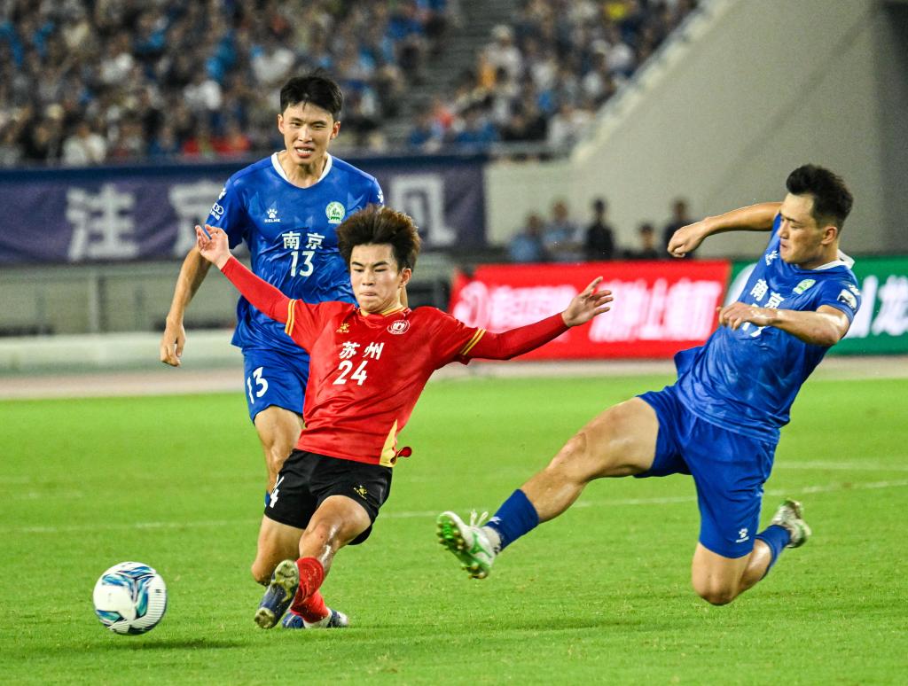 7月5日,蘇州隊球員寇程(中)在比賽中進攻。新華社記者 季春鵬 攝