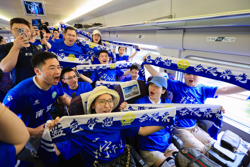 6月14日,球迷們在G9253次列車上合影留念。當日,2025年江蘇省城市足球聯賽第四輪淮安隊對陣南京隊的比賽在江蘇省淮安市舉行,鐵路部門開行南京站往返淮安東站的長三角首趟“蘇超”球迷高鐵專列,方便南京球迷前往觀賽。新華社發(蘇陽 攝)