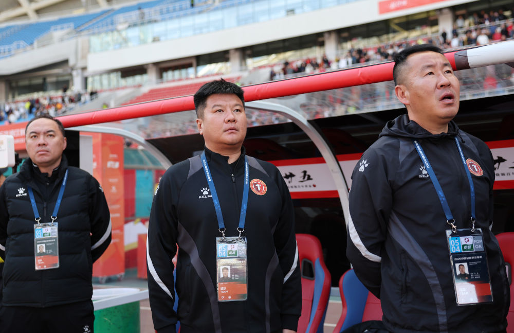 5月4日,遼寧鐵人隊主教練李金羽(中)在比賽前。當日,在瀋陽舉行的2025中國足球甲級聯賽第七輪比賽中,遼寧鐵人隊主場2比1戰勝陜西聯合隊。新華社記者 李鋼 攝