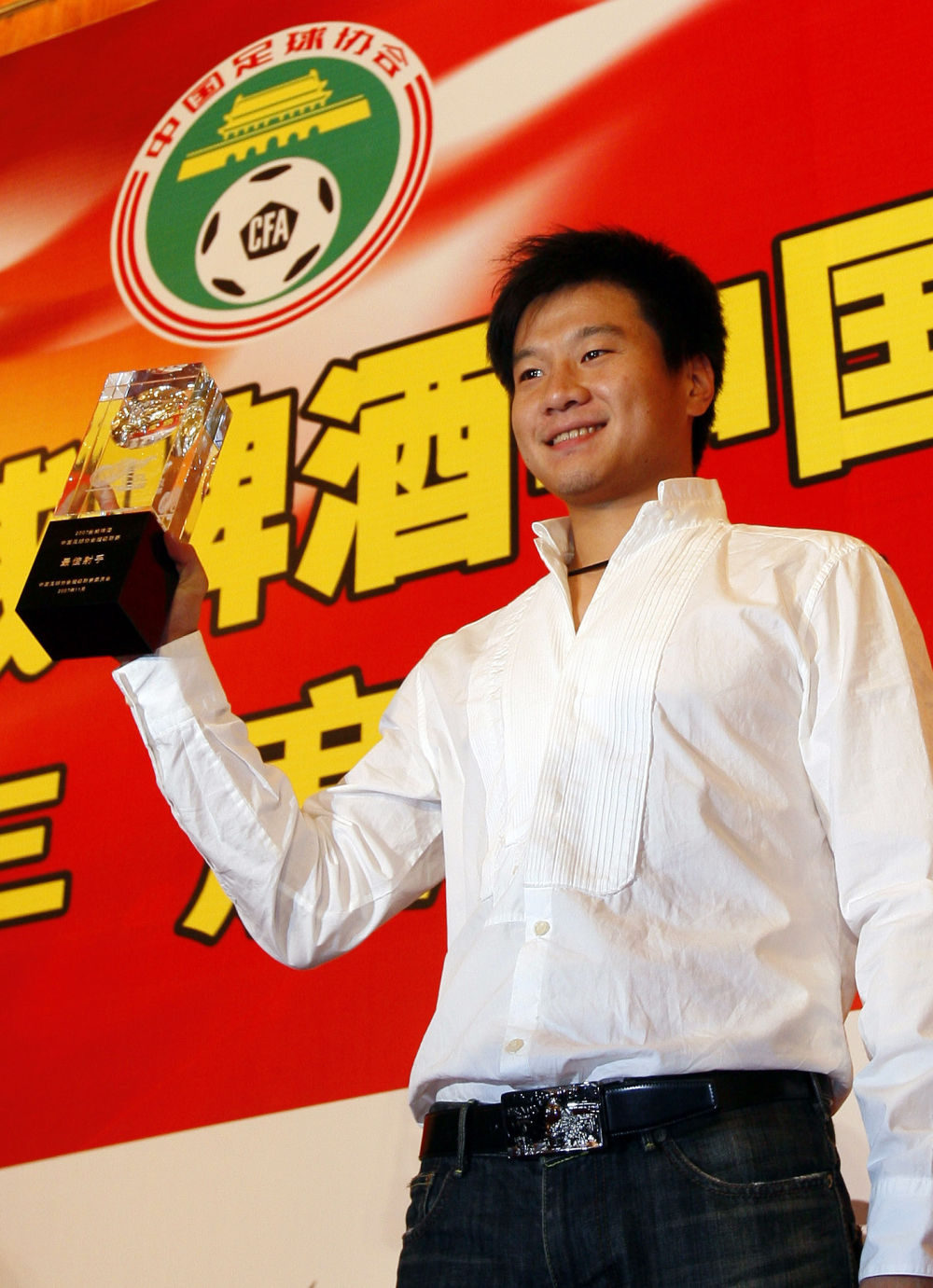 2007年11月17日,山東魯能隊球員李金羽在頒獎典禮上。當日,中國足球協會在上海舉行中超聯賽頒獎典禮,李金羽榮獲2007年中國足球超級聯賽“最佳射手”稱號。 新華社記者 凡軍 攝