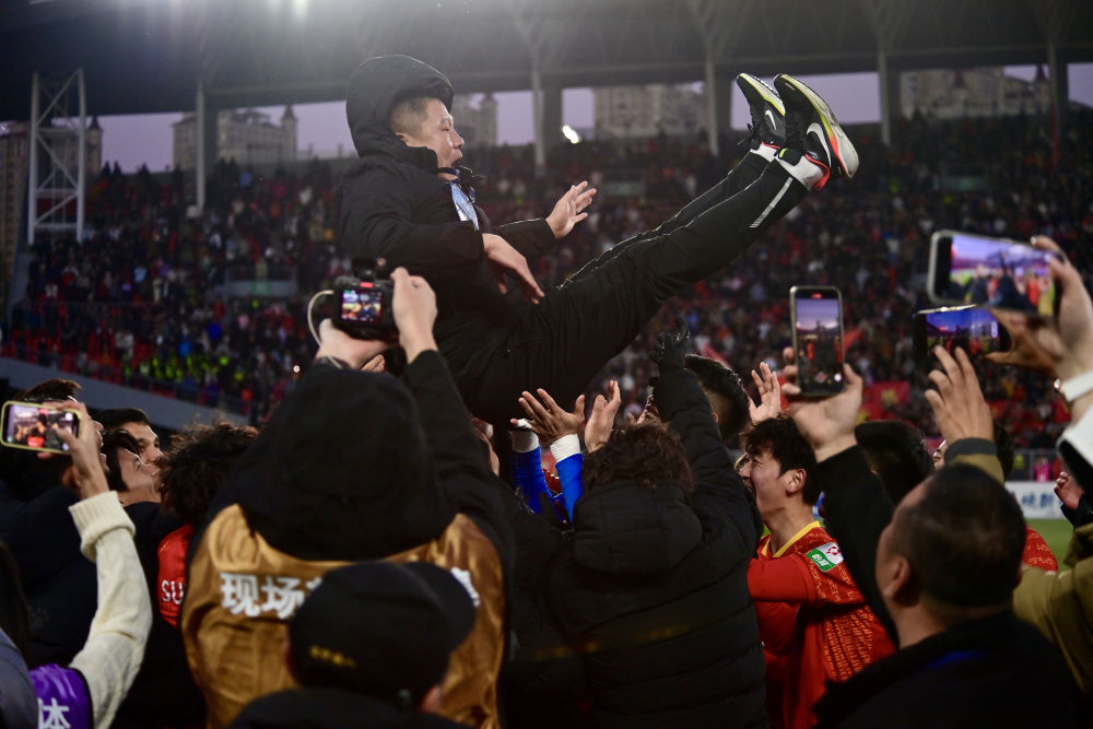 10月26日,遼寧鐵人隊主教練李金羽(上)在賽後被隊員拋向空中慶祝。當日,在遼寧瀋陽舉行的2025賽季中國足球協會甲級聯賽第28輪比賽中,遼寧鐵人隊1比0戰勝南通支雲隊,提前鎖定中甲聯賽冠軍,並實現衝超目標。新華社記者 吳青昊 攝
