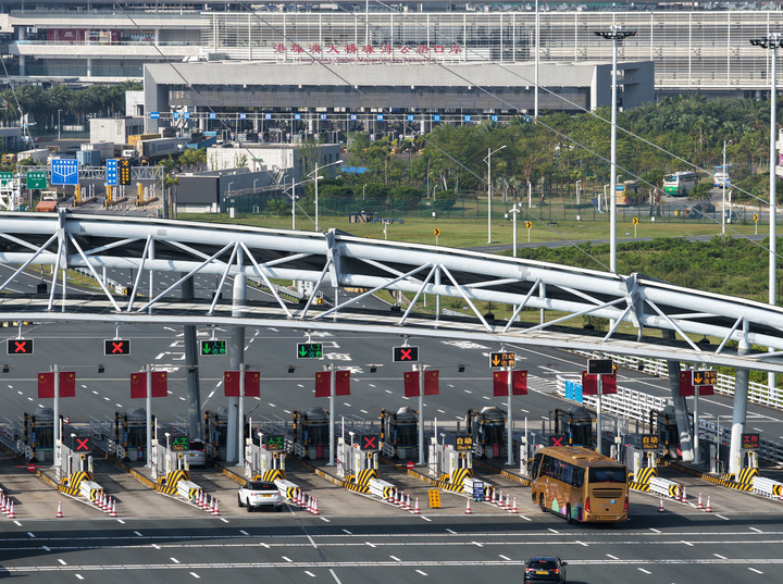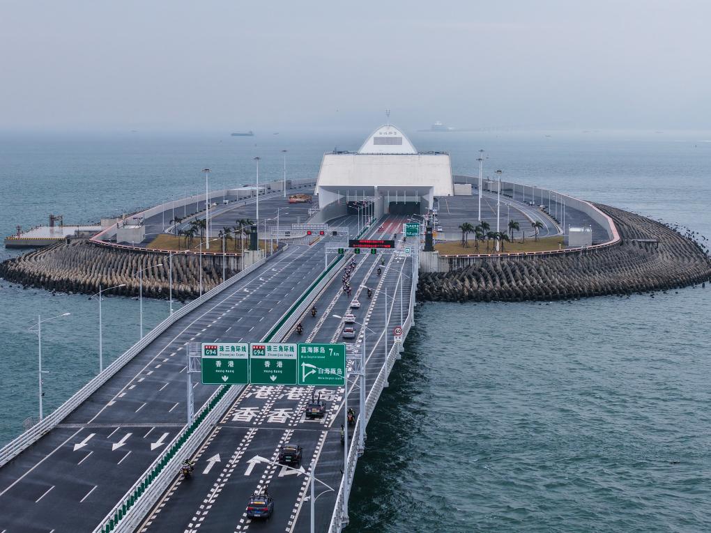 2025年10月19日,車輛經港珠澳大橋駛向珠海公路口岸(無人機照片)。新華社記者 鄧華 攝