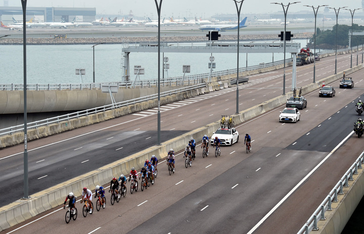 2024年11月24日的測試賽上,參賽選手在港珠澳大橋香港段騎行。新華社發(盧炳輝攝)