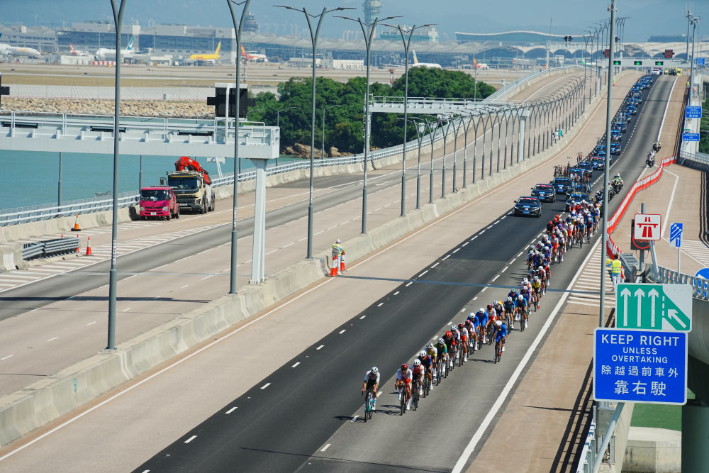 11月8日,參賽選手在比賽中。當日,第十五屆全國運動會公路自行車男子個人賽決賽開賽,全程231.8公里,選手將經過港珠澳大橋,跨越粵港澳三地。這是全運會歷史上首次舉辦跨境比賽。新華社記者 朱煒 攝