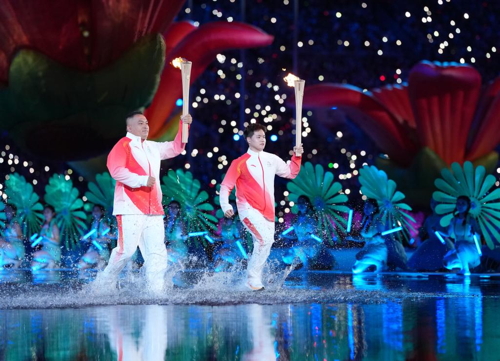 11月9日,火炬手賴宣治(左)、梁偉鏗傳遞火炬。當日,第十五屆全國運動會開幕式在廣東奧林匹克體育中心舉行。新華社記者 吳魯 攝