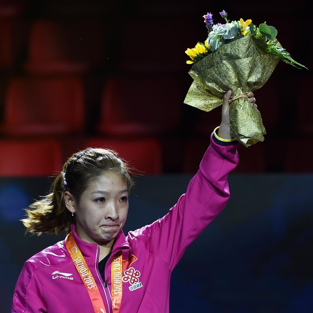 2015年5月2日,獲得亞軍的劉詩雯在第53屆蘇州世乒賽女單領獎&上。新華社記者 李響 攝