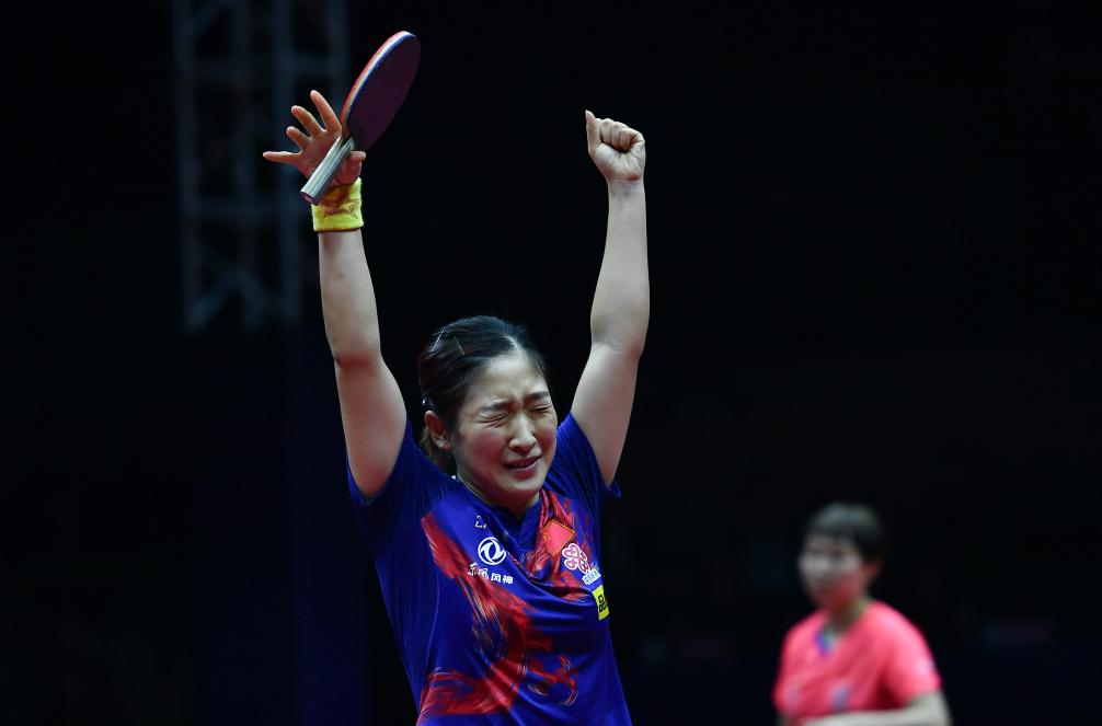 2019年4月27日,在匈牙利布達佩斯舉行的2019世界乒乓球錦標賽女單決賽中,劉詩雯以4比2戰勝隊友陳夢後慶祝奪冠。新華社記者 陶希夷 攝