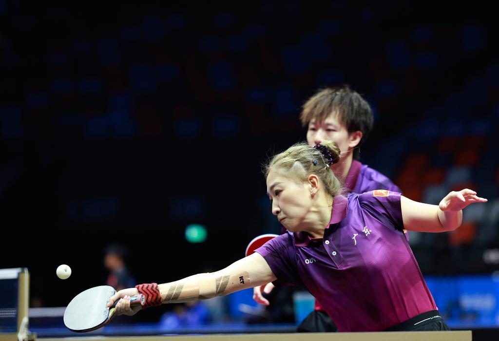 2025年11月13日,林高遠/劉詩雯(前)在第十五屆全國運動會乒乓球混合雙打半決賽中。新華社記者 梁旭 攝