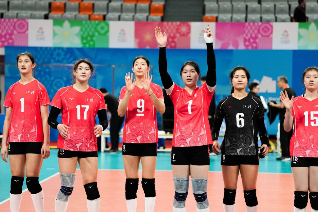11月13日,江蘇隊球員在比賽後向觀眾致意,右二為劉茗月。當日,在深圳進行的第十五屆全國運動會排球女子18歲以下組小組賽中,江蘇隊3:0戰勝四川隊。新華社記者 陳思汗 攝