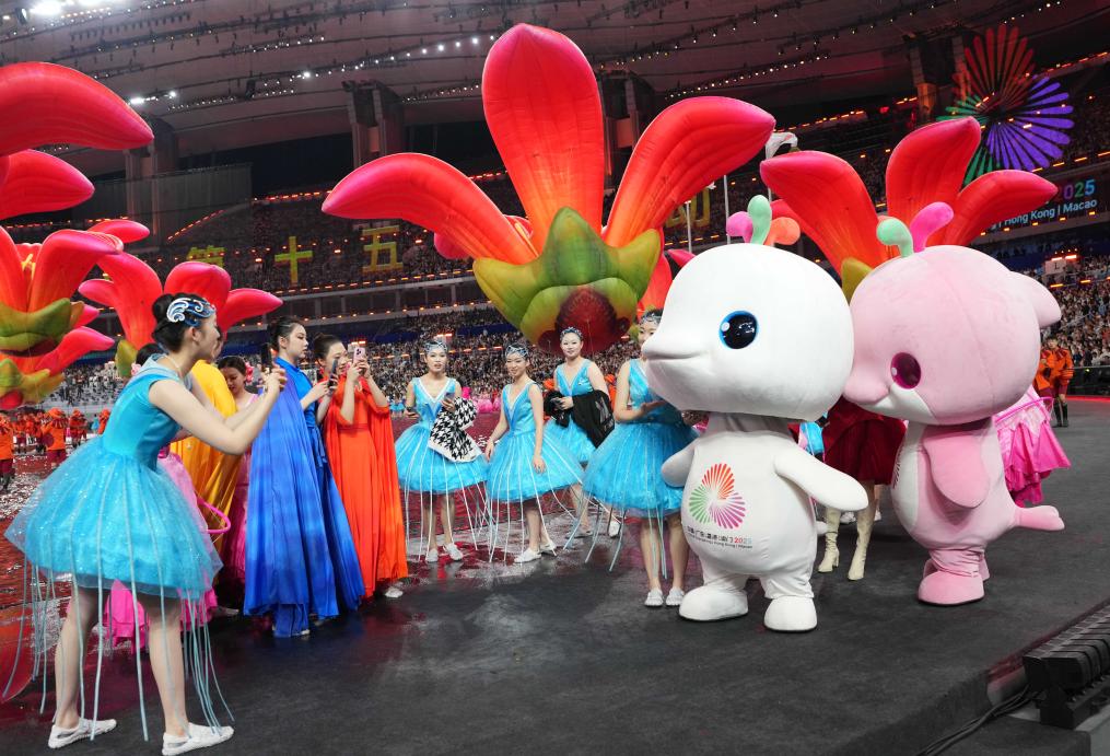 11月9日,演員在開幕式後與第十五屆全國運動會吉祥物“喜洋洋”和“樂融融”互動。新華社記者 吳魯 攝