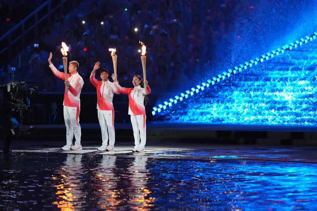 11月9日,在第十五屆全國運動會開幕式上,火炬手蘇炳添(中)、張家朗(左)、李祎點燃主火炬後向觀眾致意。新華社記者 肖藝九 攝