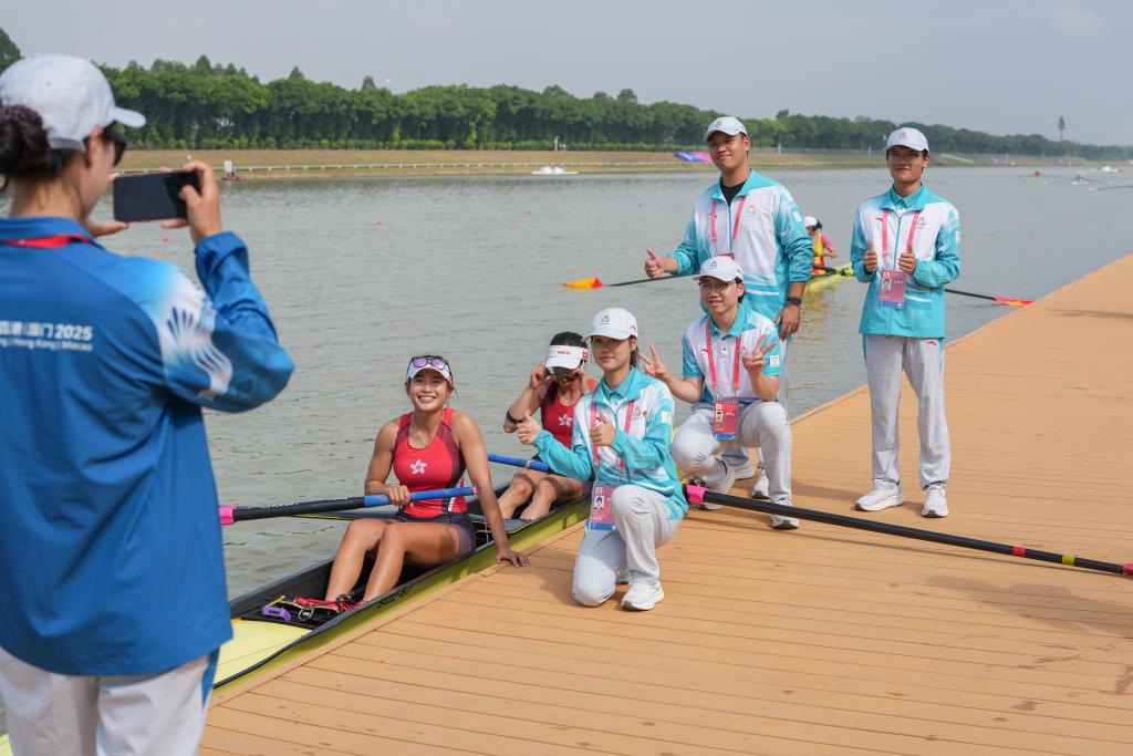 11月8日,香港隊選手黃湘儀/梁琼允在女子雙人單槳半決賽後與志願者合影留念。香港隊選手晉級決賽A組比賽。當日,第十五屆全國運動會賽艇項目半決賽在廣州舉行。新華社記者 肖恩楠 攝