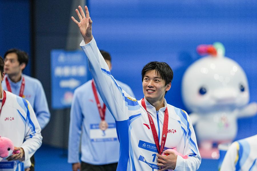 2025年11月10日,冠軍浙江隊選手汪順在第十五屆全國運動會男子4X100米自由泳接力頒獎儀式後向觀眾致意。新華社記者 丁增尼達 攝