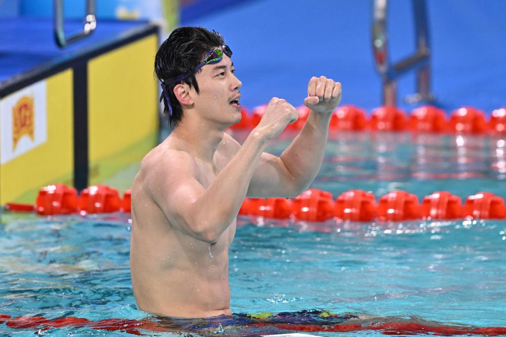2023年9月24日,汪順在杭州亞運會游泳比賽男子200米個人混合泳決賽後慶祝,他以1分54秒62的成績獲得冠軍。新華社記者 黃宗治 攝