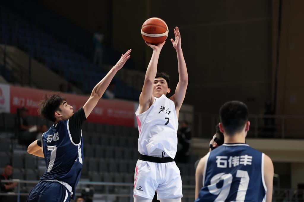 11月10日,浙江隊球員李悅洲(中)在比賽中投籃。當日,在澳門舉行的第十五屆全國運動會籃球男子18歲以下組小組賽中,浙江隊106比71戰勝湖南隊。新華社記者 孫凡越 攝