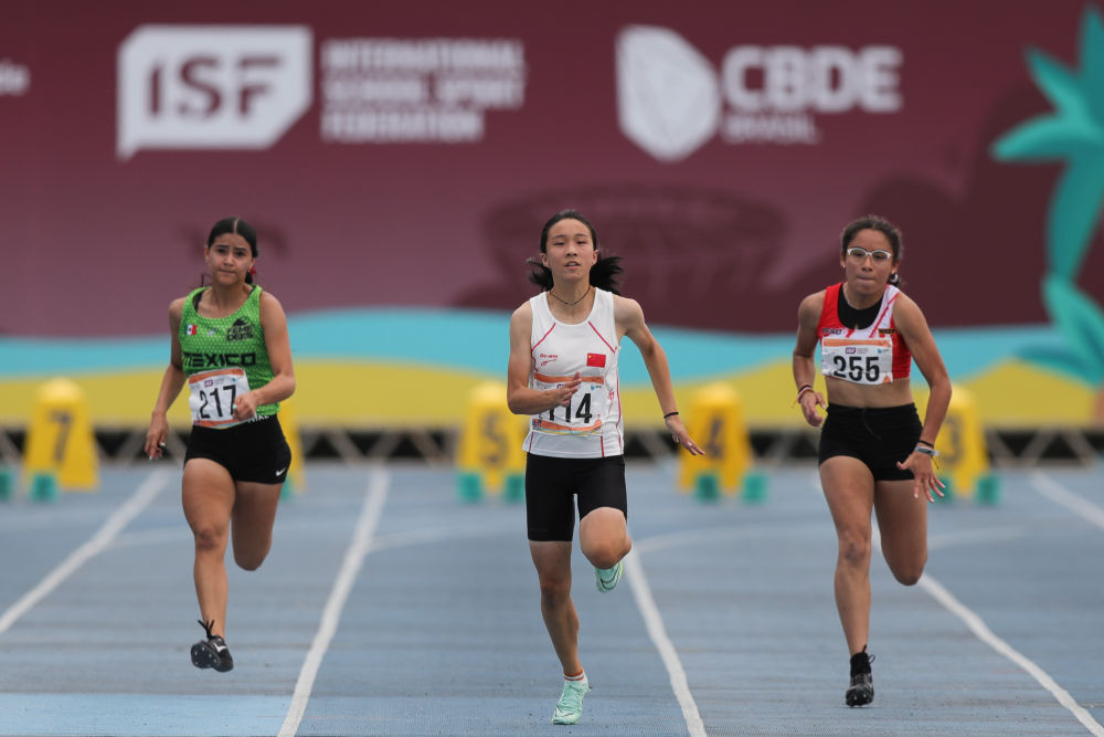 2023年8月21日,在巴西裏約熱內盧的U15世界中學生夏季運動會上,陳妤頡(中)以11秒56平賽會紀錄的成績獲得女子百米金牌。新華社記者 王天聰 攝