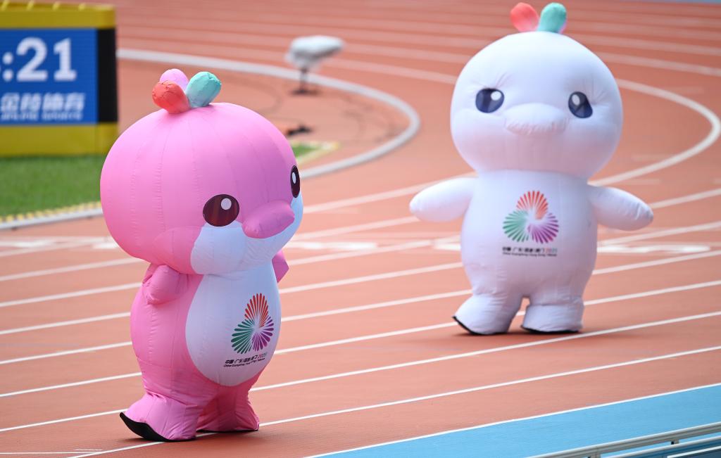 11月15日,吉祥物“喜洋洋”和“樂融融”在比賽間隙表演。當日,第十五屆全國運動會田徑項目在廣州開賽。新華社記者 鄧華 攝