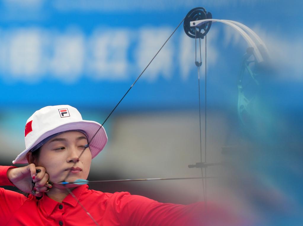 11月20日,江蘇隊選手張心妍在全運會射箭複合弓混合團體金牌決賽中。新華社記者 郝源 攝