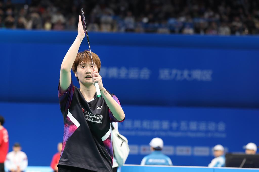 11月18日,浙江隊選手陳雨菲在比賽後向觀眾致意。當日,在廣東深圳舉行的第十五屆全國運動會羽毛球女單半決賽中,浙江隊選手陳雨菲2比0戰勝福建隊選手韓悅,晉級決賽。新華社記者 丁汀 攝