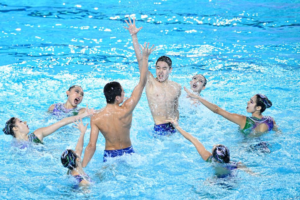 11月14日,北京隊選手郭牧兮/郭牧也(男)和隊友們在花樣游泳集體技巧自選比賽中。新華社記者 陳鐘昊 攝