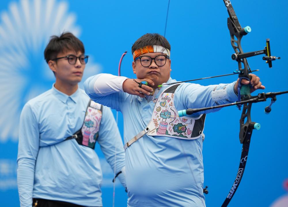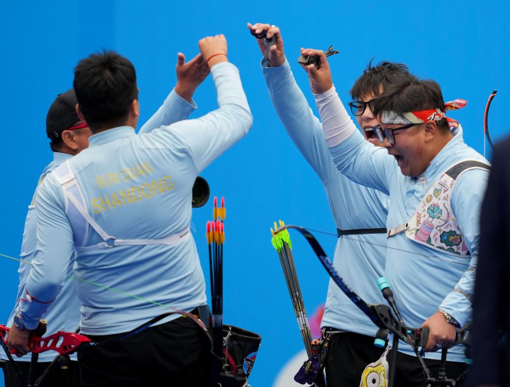 自信的不止是李夢麒。決賽第二局,比賽緊張到令人窒息,全場觀眾鴉雀無聲。山東隊馮浩箭剛離弦,他就大喊一聲“漂亮”,聲音響徹全場。話音剛落,箭頭穩穩紮在了黃心上,“10環!”