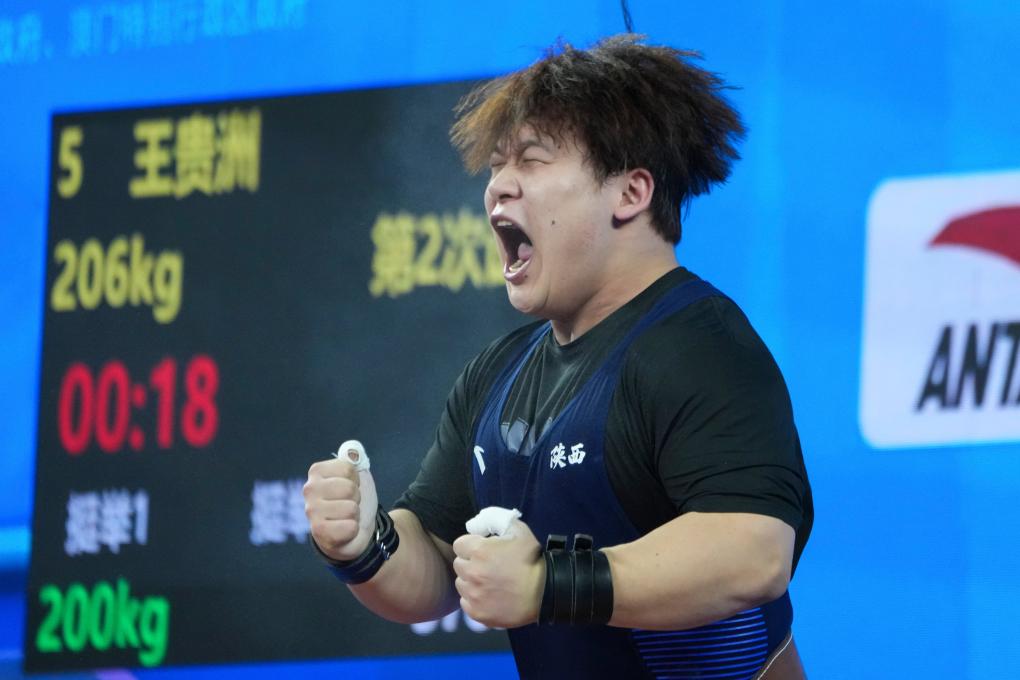 11月20日,陜西隊選手王貴洲在挺舉比賽中試舉成功後慶祝。新華社記者 楊晨光 攝