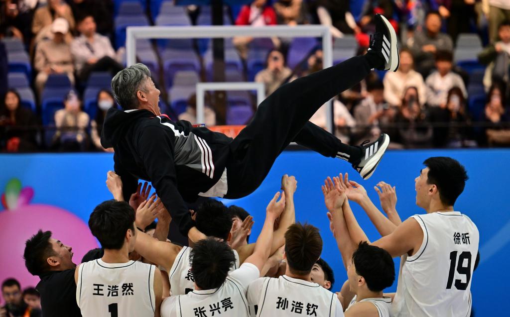 11月20日,廣東隊球員將主教練鄭永剛拋起慶祝奪冠。新華社記者 於洋 攝