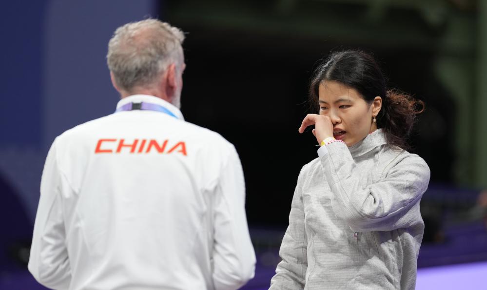 2024年7月29日,中國選手楊恒鬱(右)在巴黎奧運會女子個人佩劍32強比賽間隙與教練交流。新華社記者 費茂華 攝