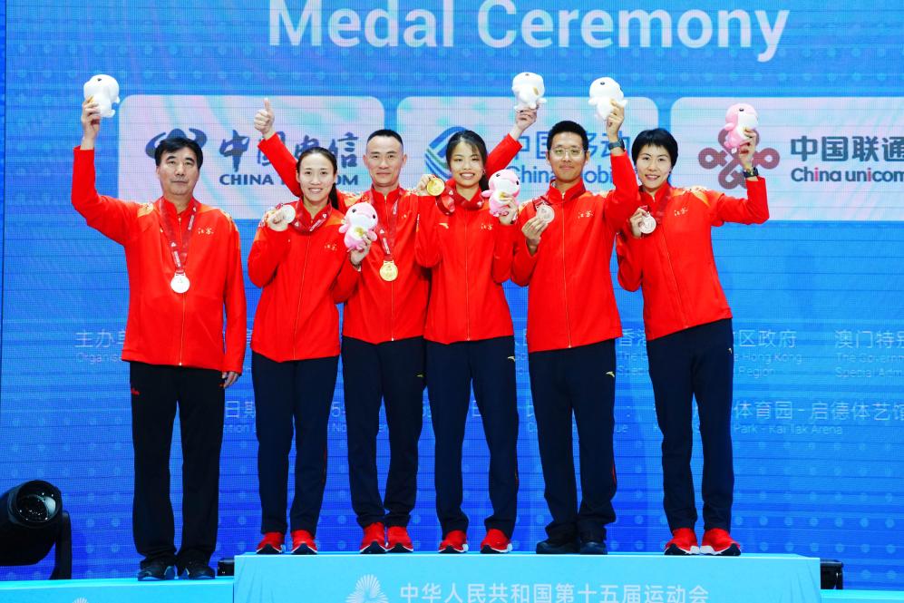 11月16日,分獲冠、亞、季軍的江蘇隊選手楊恒鬱(右三)、傅穎(左二)、錢佳睿(右一)在頒獎儀式上與教練合影。新華社記者 朱煒 攝